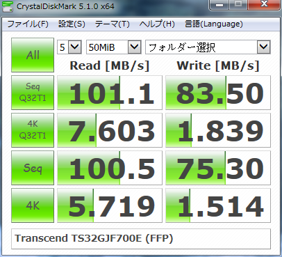 シーケンシャルリード 101MB/s、シーケンシャルライト 83MB/sと一昔前のHDDなみの