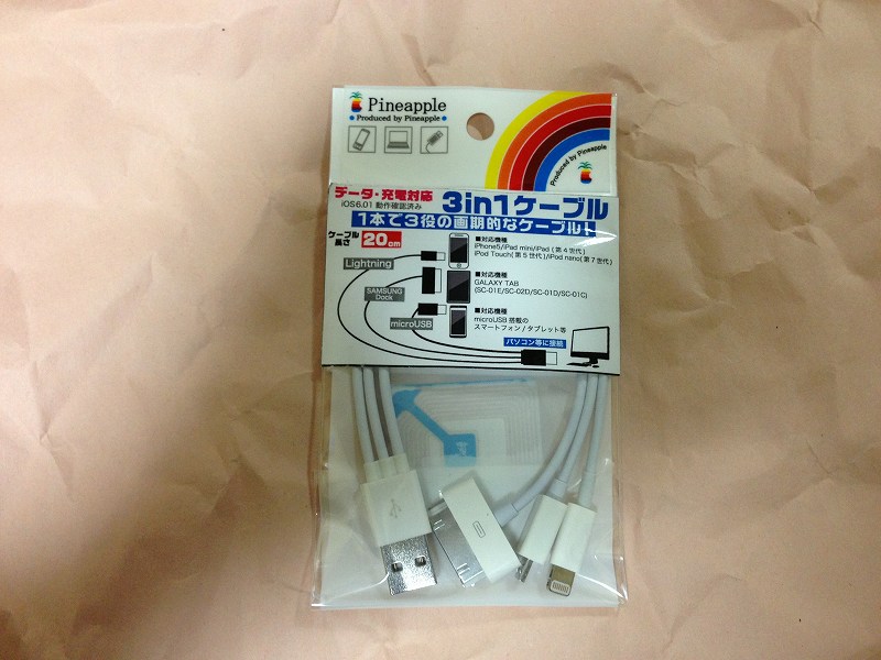 下がIpad(30PIN)、上左がL-04D(MICROUSB)、