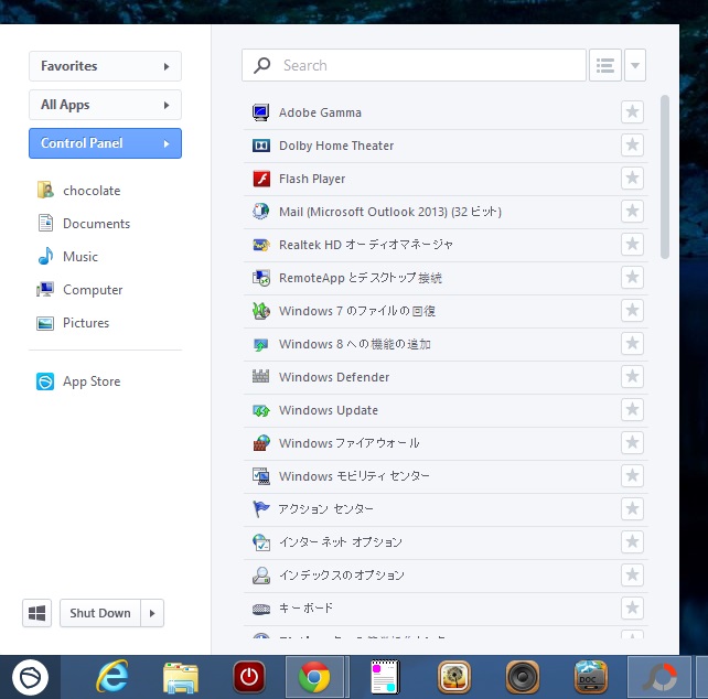 コントロールパネルも一覧表示され、よく使う機能はお気に入りとしてFavoritesにまとめられます。