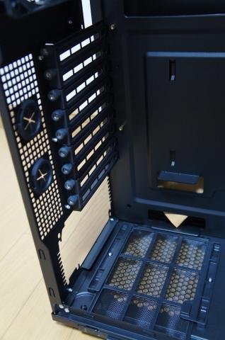 フロントです。5インチベイが3段用意されてます。フロントファンは未搭載ですが、12㎝ファンが2基搭載可能となってます。内部には、ダストフィルターが装着されています。