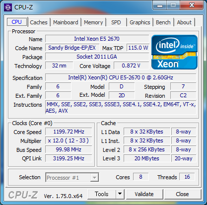 まずはCPU-ZでCPUの詳細を確認します。本来Xeon E5-2670はQPI 8GT/sに対応しているのですが、この環境では6.4GT/sで動いているようです。