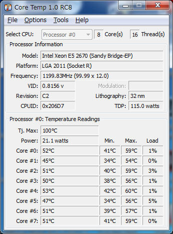 なかなか面白いのは、6コアのCore i7-3930KがTDP 130Wであるのに対して、Xeon E5-2670はTDP 115Wに収まっているという点でしょうか。実際に負荷をかけ続けてみても、Core i7-3930Kよりも明らかに低い温度で動いていることがわかります。