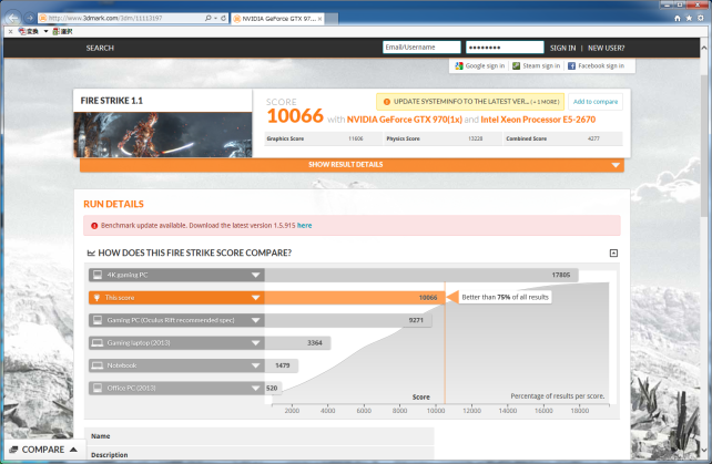 以前Core i7-3930Kで出した値と殆ど変わらないものとなりました。以前の結果はGeForce GTX 970の拙レビューでご覧いただけますので、そちらでご確認下さい。