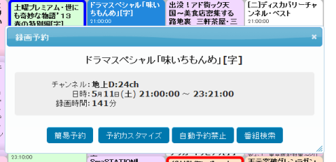 番組表から番組タイトルを選択するとこのような子画面が出てきます。