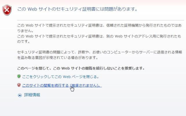 ブラウザが立ち上がりますが、セキュリティ証明書の問題がある旨の警告が表示されますが