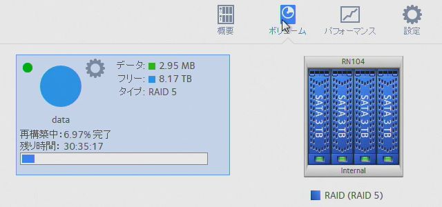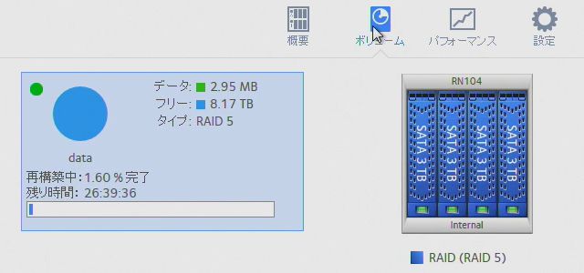 再起動はボリュームの再構築(再構築となっていますが最初の)中なのでこれが終わってから再起動することにしたので「閉じる」を選択。