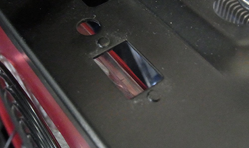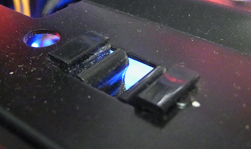 ご覧のとおりトップパネル前方2箇所のみ汎用部品ではなく本体の樹脂部から直接出ている形状。このトップパネル前部は外装もかねているので、実はPC-P50は「完全なフルアルミケース」ではなかったりする。まあココ以外の外装は全てアルミなのだが。