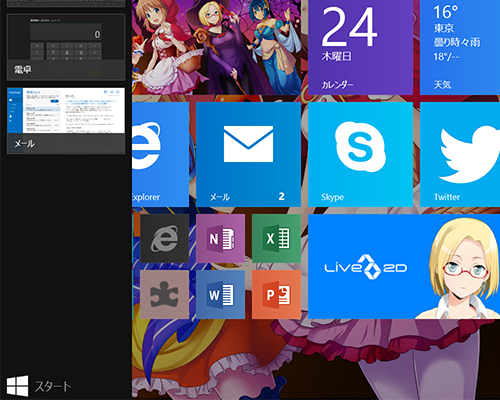 そして個人的に最大のメリットがこのスタート画面の背景。さっきからスクリーンショットで思いっきり窓辺さんちが写ってますが、デスクトップ壁紙を維持するように設定できるようになったのだ。せっかく窓辺テーマを入手したのによく見るスタート画面で壁紙がないのはすごく納得いかなかったのでこれでOK。