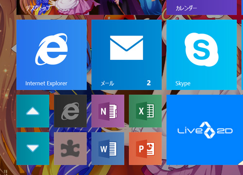 またスタート画面とデスクトップ画面の行き来がし易くなったので、今までスタート画面にデスクトップ用ソフトも混在させていたのを、なんとなく残したOfficeを除いてすべてタスクバー側に移動。キーボード&マウス時はデスクトップ画面前提で、それ以外の時はスタート画面…それもスクロールしない範囲で完結させられるようになった。