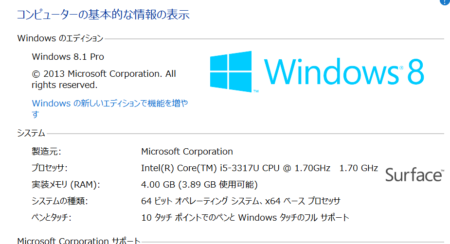 で、当然Surface Pro2はWindows8.1モデルで、こちらのSurfaceProはWindows8。見た目も近いしOSを8.1にしてしまえばPro2への偽装も捗ります。