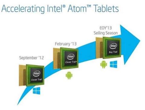 今まで、WindowsTabletがあまり日の目を見てこなかったのは、CPUPowerがあまりにも無く、使い勝手が悪かったわけで、CPUのロードマップをインテルさんから拝借して説明しますと、Bay Trail-T は AtomベースのCPUですが、22nmプロセスで製造する新CPUコアを採用、GPUにIntel HD Graphicsを採用しており、2世代前は(作ってみたかった)Windows用、1世代前は主にAndroid用、そして今回はWindows 、Android 共用と戦略的なCPUの位置づけです
