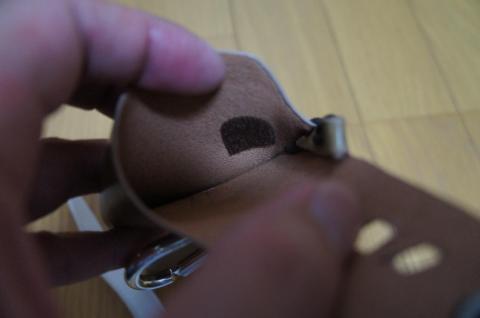 表のボタンの裏側には、ちゃんと当て布をしてあって、iPhoneへキズが入らないようになってます。
