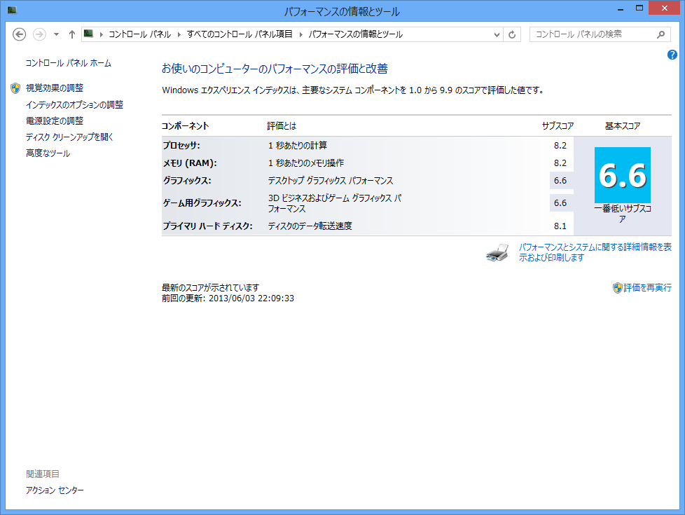 BIOSでHigh Perfomanceにした状態のWindows8のエクスペリエンスです。