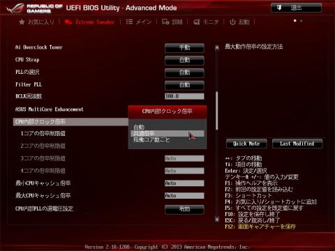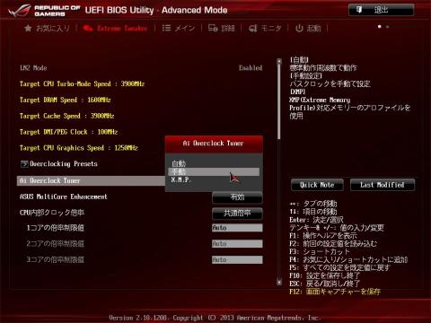 UEFIの設定項目から「Extreme Tweaker」を選択し「Ai Overclick Tuner」を「手動」に設定します。