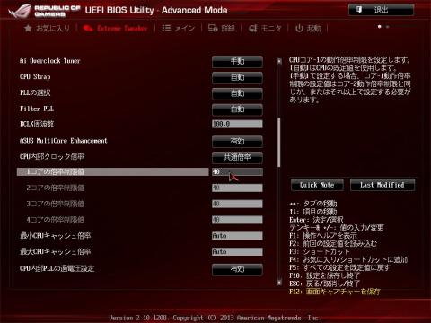 コアの倍率変更を設定します。下図では「40」に設定したので、ベースクロック100MHz×倍率40で「4GHz」にりました。