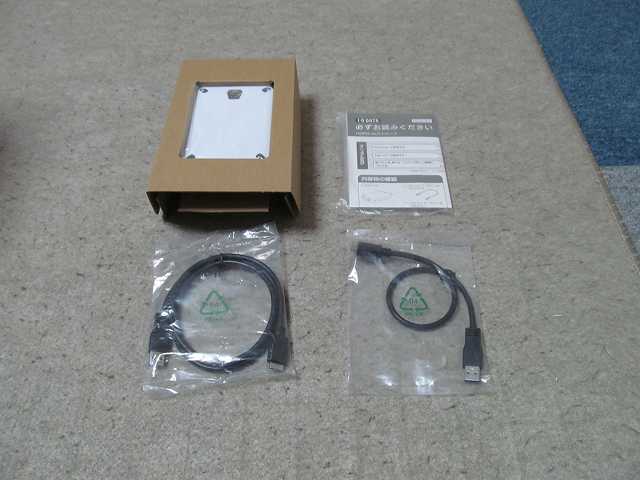 HDDの箱を開けるとHDD本体、USBケーブル2本、マニュアルが入っていました。