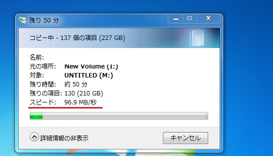 データ転送中に若干作業をした(ただし転送元と転送先のディスクを使用しないようにしたが、1回だけミスで転送元のHDDのデータを削除した)ので完全なテスト環境ではありませんでしたが快適にデータ転送を行うことができました。