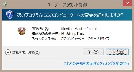 「ユーザー アカウント制御」の確認が表示されるので。「はい(Y)」をクリックします。