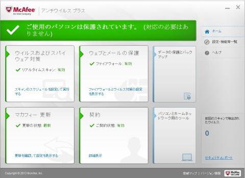 さて私も、MSEを削除し早速インストールして見ました。これがMcafeeアンチウイルスプラスのトップ画面です。