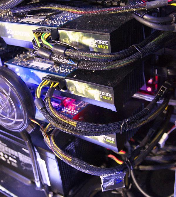 660Tiの3-way SLIでは合計6つのコネクタが必要になるので、ペリフェラルまたはSATA電源コネクタから変換ケーブルを使って接続する必要があります。