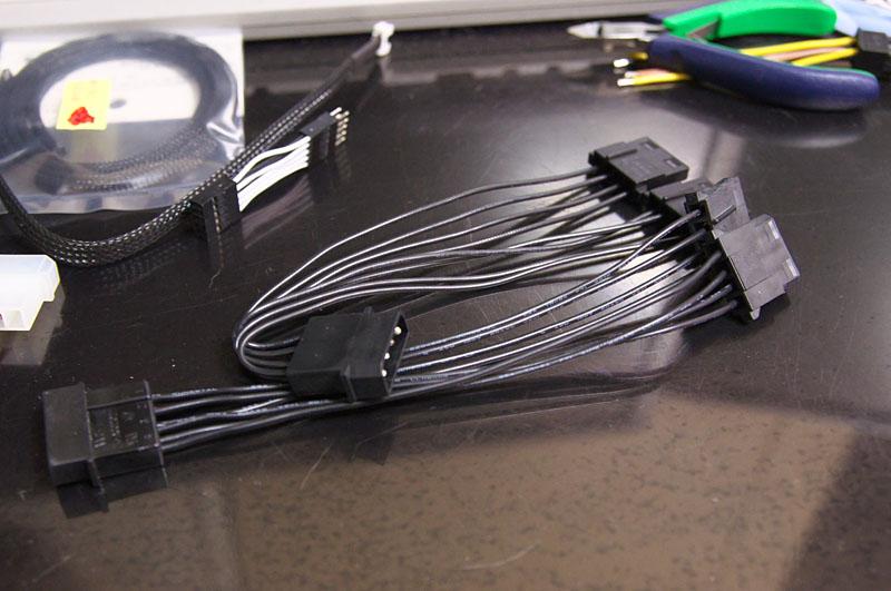 手元にあったケーブルは、ペリフェラル×2をPCI-E 6ピンに変換するものですが、コネクタが白いのと、ペリフェラルを2系統使用するのであまりよろしくありません。