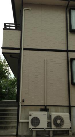 約9mに及ぶ、室外配管です。(今回取り付けの室外機は右側です)