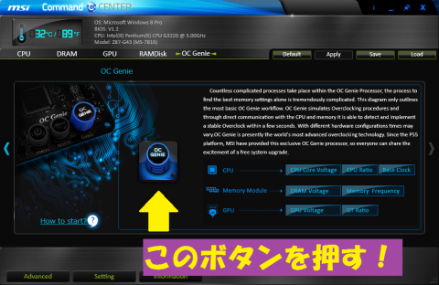 上記のいちばん左のタブに「OC Genie」があり、それを開くと、UEFIと同じようにOC Genieボタンが現れるのでそれをクリックして再起動するだけです。
