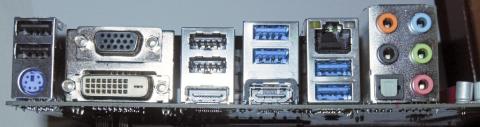 PS/2ポート, HD15ピンと DVI-D, HDMI out, HDMI in, USB3.0x4 USB2.0 x4 (うち一つは Fatal1ty Mouse Port), GbE, 光出力, audio 5系統 です。