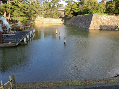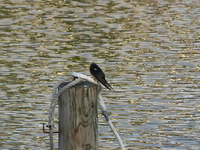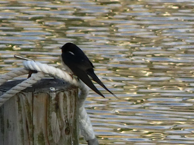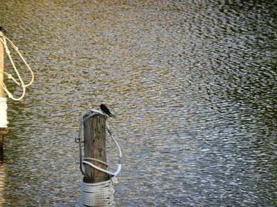 松江城のお堀の杭に1羽のツバメが休んでいました。