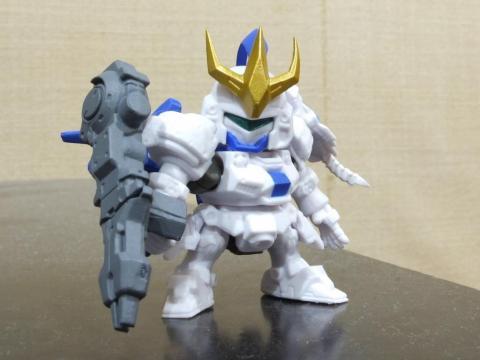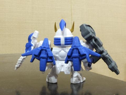 右肩のビーム兵器メガキャノンは手に持たせることもできます。本当は展開して高出力モードになるのですがこのガシャポンでは再現されていません。