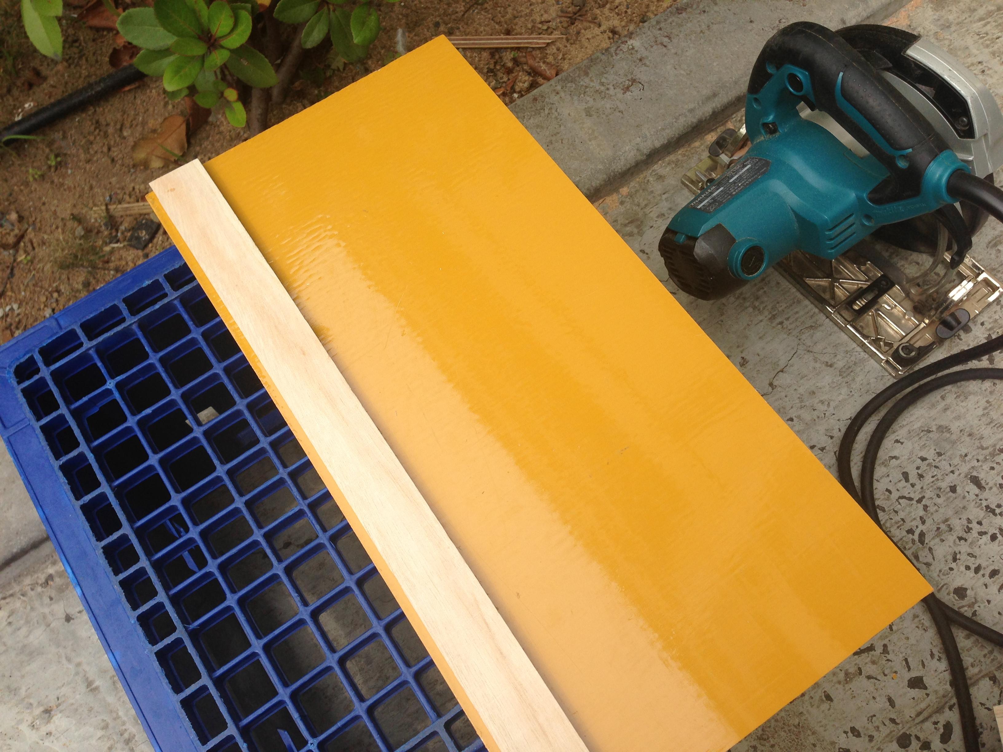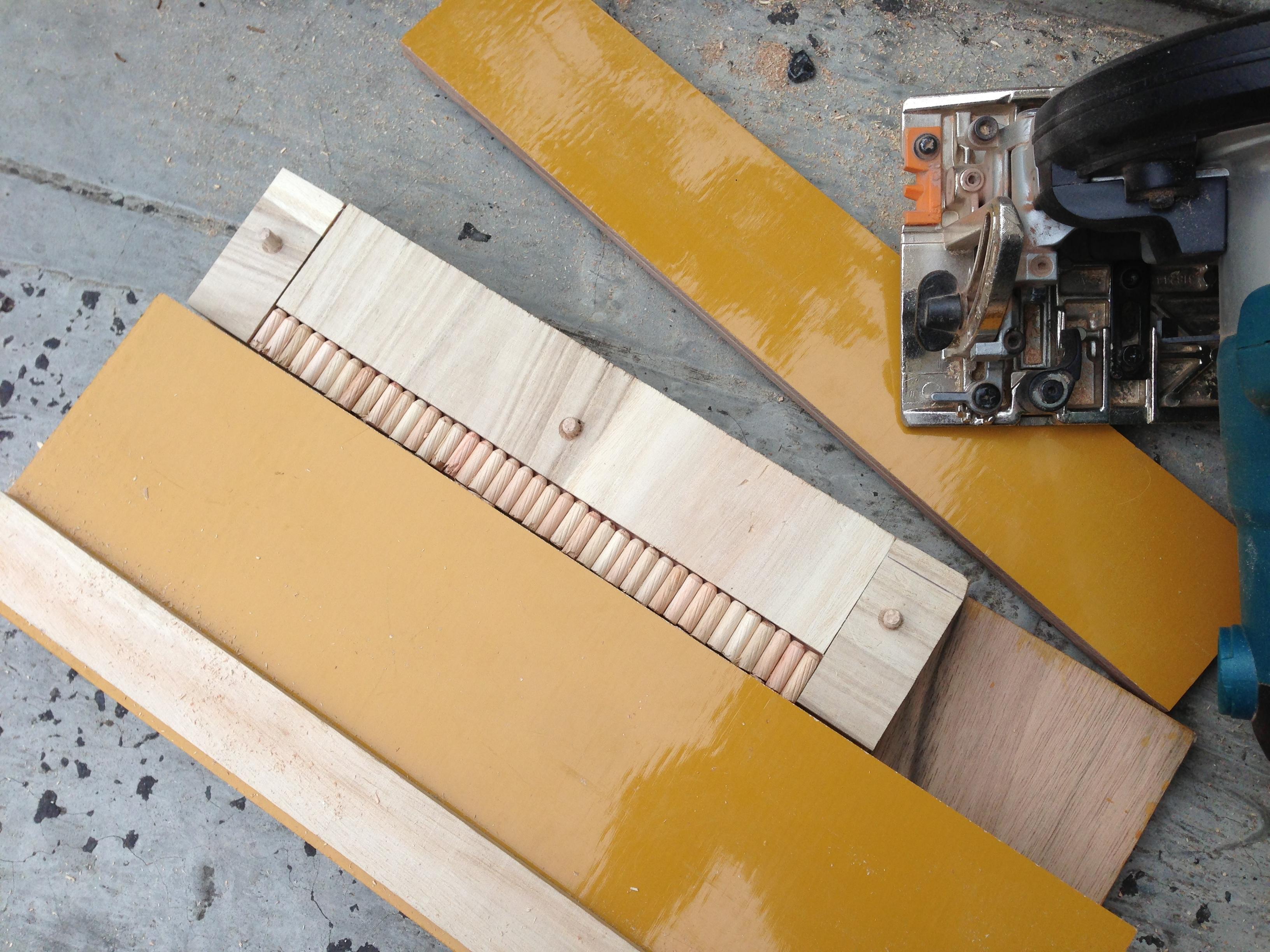 丸のこの刃が走るので下にコンパネ端材を置いてその上に適当なパネコートをダボ止めします
