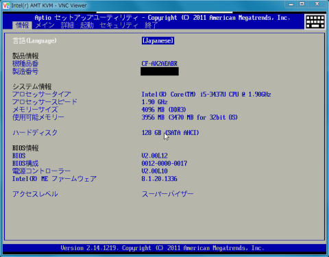 このパソコン(CF-AX2AEABR)はデフォルト設定だとIntel Management Engineのセットアップが起動しないようになっているので、まずはセットアップユーティリティ(BIOS)でアクティブ・マネジメント・テクノロジー(AMT)の設定を行います。