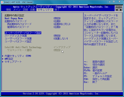 「AMT設定」はスーパーバイザーパスワードを設定しないと変更できないようなので「セキュリティ>スーパーバイザーパスワード設定」でパスワードの設定を行います。