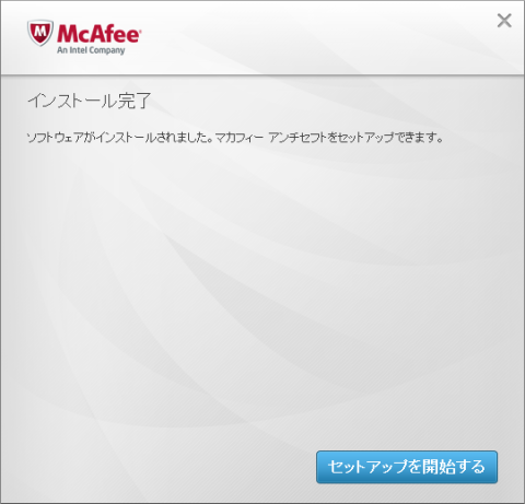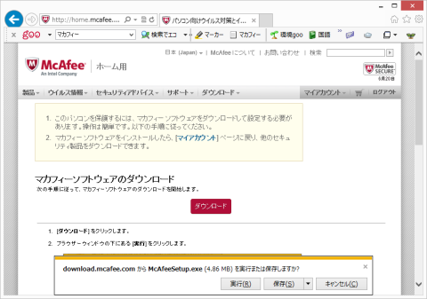 登録用のソフトウェアがインストールしてあるだけで本体はインストールしていないみたいです。アカウント登録を行った場合はメール認証でマカフィーのサイトにログイン、ダウンロード、インストールという流れなのかもしれません。マカフィーのサイトにログインしてみたらこんな表示だったので再インストールを押してセットアップを行います。