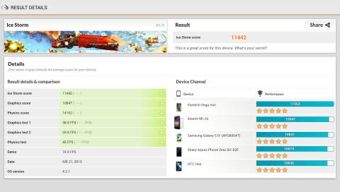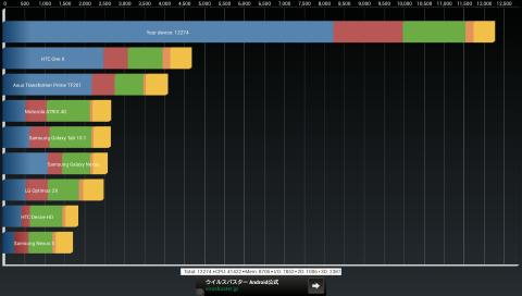 現状、Snapdragon 600 1.7GHzクアッドコア搭載機しか達成していない大台のスコア一万超えを達成しています。