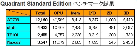 比較のため先に出てきた dtab、TF 101に加え Nexus 7も併せてベンチマークを行い比べてみました。