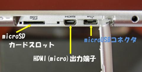 microSDカードスロット、HDMI(micro)出力端子、microUSBコネクタがあります。