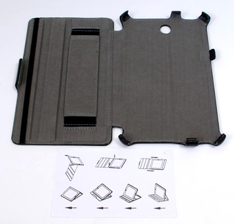 説明文は無くて絵で判断してくれというレベルの説明書です。ケース蓋になる部分には、端末使用時に裏に折り返した時に片手持ちで安定するようにゴムバンドが付いています。
