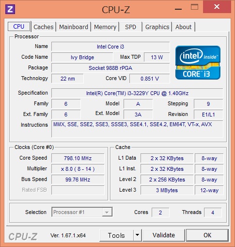 プロセッサ:Core i3-3229Y(2コア/4スレッド、1.4GHz、キャッシュ3MB、TDP 13W)
