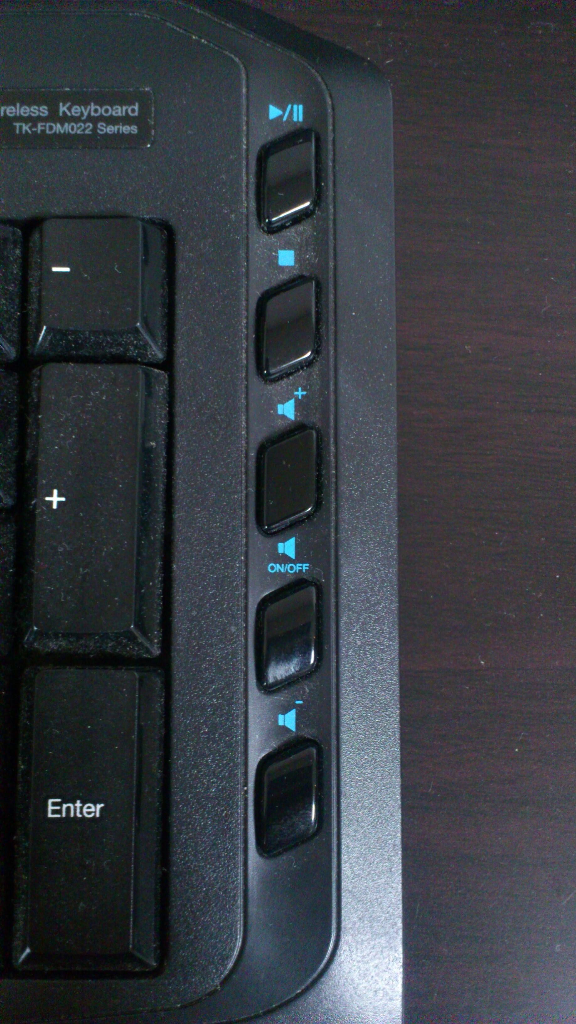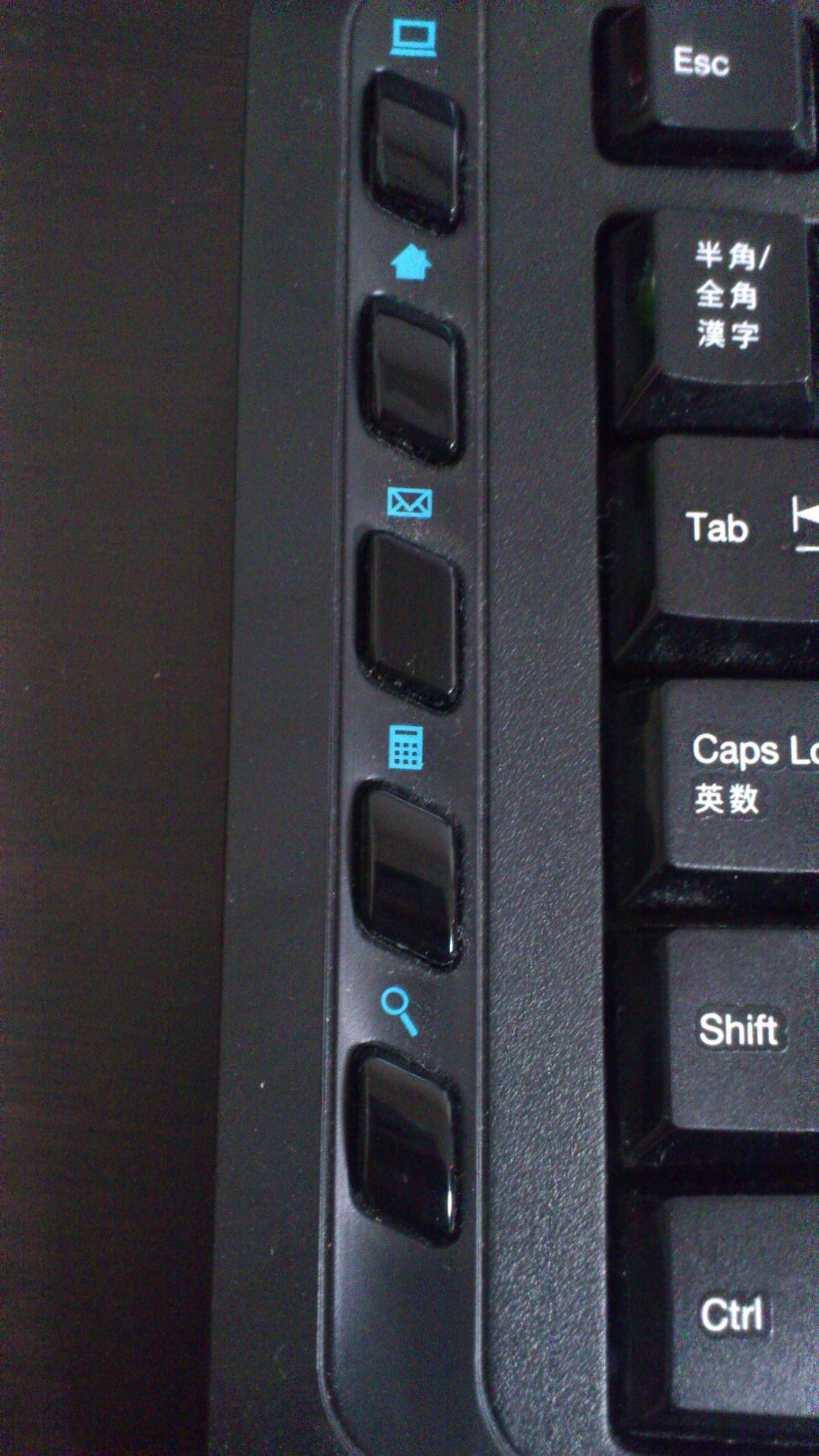 具体的には、マイコンピュータ、インターネット、メール、電卓、検索、再生/一時停止、停止、ボリューム+、ミュート、ボリューム-、が付いています。