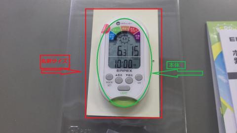 - 機能:UVチェッカー、温度計、湿度計、時計、LEDライト、SPF値、UVI値、WBGT値、絶対湿度表