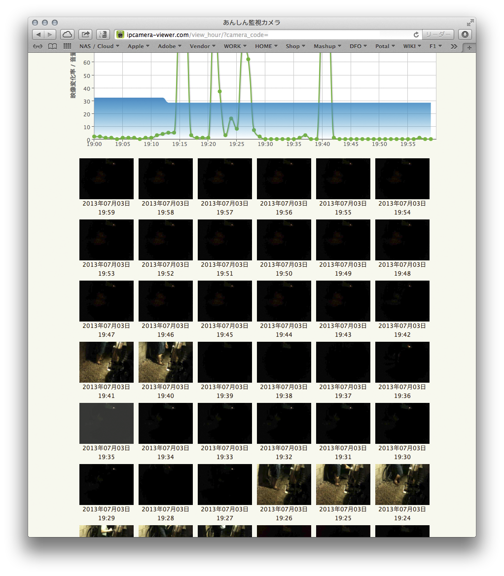 「一覧」ボタンを押すと,人間が通った場合は大きくグラフが変動するのでその時間帯の写真を確認できる。ネコなどの小動物では反応が小さすぎて見つけにくいが,それは写している視野の大きさに依存する。