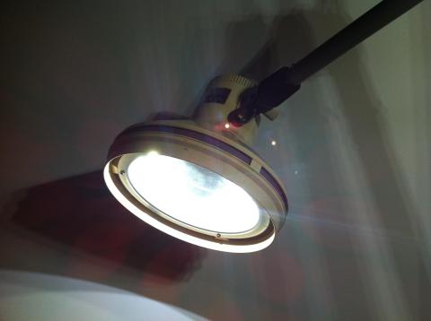 そして、2013年、LEDライトとしてよみがえりました。3W x6灯で、ドライバICが消費する分を考えても20W 未満です。にもかかわらず、このライトの一生のうち今が最も高照度で輝いている!