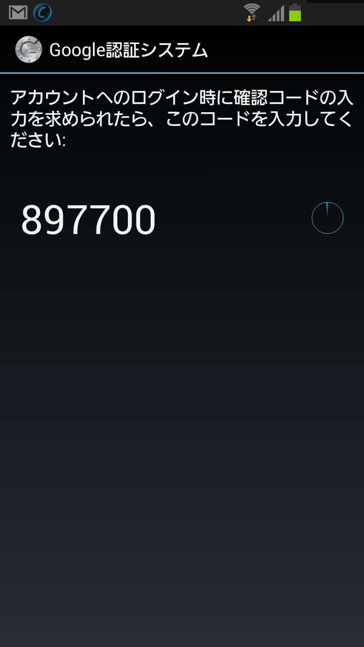 メールアドレスと、時間を消してますが、実際には円グラフがワンタイムパスワードの有効時間が少なくなるにつれ、面積が減少していき、なくなると新しいパスワードが生成されます。