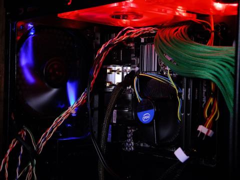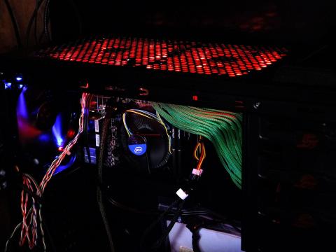 リアファンのLEDが控えめな発光なので、赤と青という2色構成のわりには個々の発光を妨げることはないですね。でも緑のケーブルはちょっと凶悪。