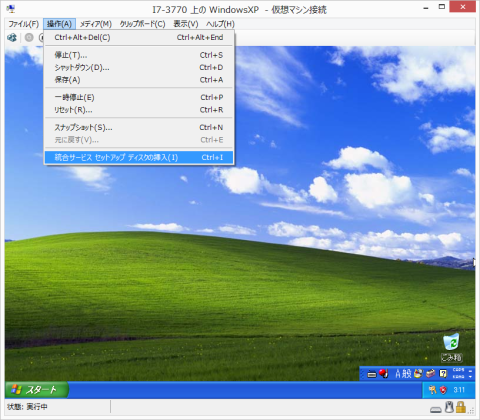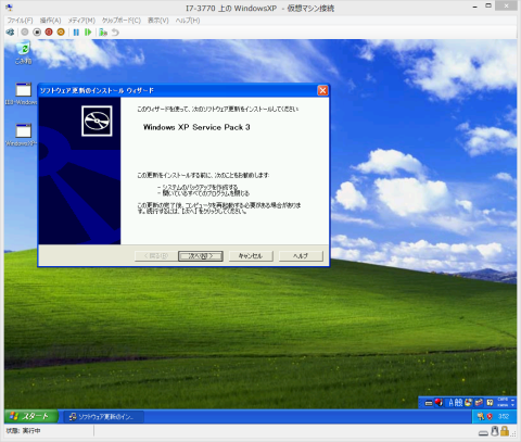 まずは統合サービス セットアップ ディスクの挿入を行います。挿入が終わったら再起動します。「統合サービス セットアップ ディスクの挿入」でインターネットに接続できるようになったので、普通にWindows XPを使うときと同じように、アップデートなどを行います。
