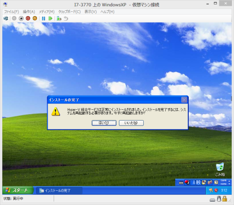 Hyper-Vの有効化を行います。コントロール パネルを開いて「コントロール パネル > プログラム >プログラムと機能 > Windows の機能の有効化または無効化」を選択します。「Windows の機能」というダイアログボックスが開くので、Hyper-Vをチェックして閉じます。必要な修正が完了したら再起動します。Hyper-V 管理ツールのHyper-V マネージャを起動します。仮想マシンでインターネットにアクセスできるようにするために、仮想スイッチ マネージャで仮想スイッチを作成します。外部を選択します。適当な名前(今回は「仮想スイッチ」という名前にしました)をつけて、ネットワークアダプターを選択したらOKを押して仮想スイッチを作成します。それでは仮想マシンを作成します。「操作 > 新規 仮想マシン」を選択します。「仮想マシンの新規作成ウィザード」が開くので、設定をしていきます。仮想マシンの名前と場所を指定します。名前はWindowsXP、場所はシステムドライブのSSDは容量が少ないので、今回はHyper-V用に増設したHDDを指定しました。メモリは16GBで余裕があるので、今回は3GB割り当てました。ネットワークは先ほど作成した「仮想スイッチ」を使用します。接続する仮想ハード ディスクを作成または指定します。今回はWindows XP SP2のCDでインストールするので光学ドライブを指定しました。確認して問題がなければ完了を押します。作成した仮想マシンに接続します。ドライブにWindows XPのディスクを入れて「操作 > 起動」で仮想マシンを起動します。起動するとWindows XPのセットアップが開始します。通常のインストールと同じように行っていきます。インストールが終わって起動しました。