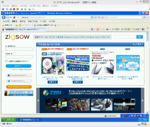 「Internet Explorer 8」と「Service Pack 3」をインストールします。Windowsライセンス認証を行ってからWindows Updateを行います。アップデートが終わったので、zigsowのページを見てみました。少し重い感じはありますが、普通に使えます。Flash Playerを入れていなかったのでインストールしました。もっと重い感じかと思っていましたが普通に再生しました。仮想マシンのWindows XP(800x600)で動画を再生しているところを、アマレココで録画してみました。
