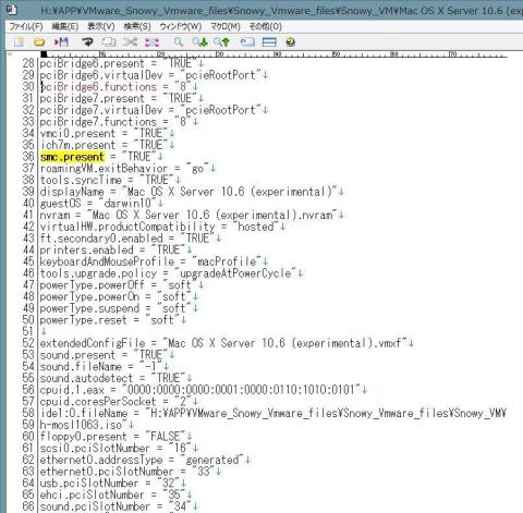 次はカーネルパニック防止のため、インストールしたフォルダーにある”Mac OS X Server 10.6 (experimental).vmx”をエディターで開いて、「smc.present」を検索して"TRUE"を"FALSE"に変更する