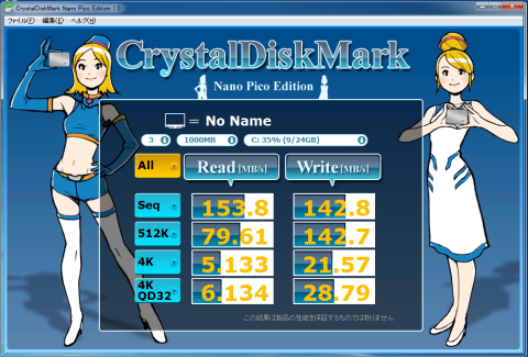 VT-dはI/O処理の仮想化を支援するとのことでSSDの転送速度を比較しました。(CrystalDiskMark Nano Pico Editionを使用)